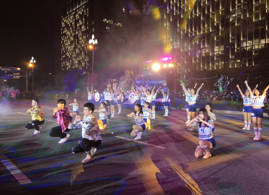 晚上7点30分,福州花海公园人山人海,盛大的花车巡游活动正式拉开帷幕。御书屋 的学生作为其中的一支表演队,以动感激情的爵士舞展现了热情洋溢,充满阳光的活力形象。随后的巡游音乐学子以方阵表演的形式与现场热情的市民朋友们互动,赢得了现场观众的好评。