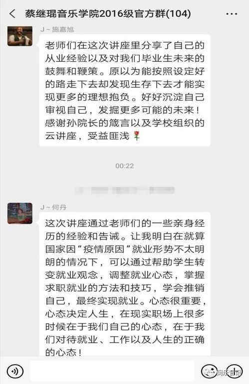 在腾讯会议的云平台,邹敏华院长先向参加讲座的毕业生们介绍了当前的形势,以及开展此次讲座的意义。接着刘淘老师介绍了孙院长辉煌的艺术生涯,隔着电脑屏幕孙砾院长结合着自身经历和身处疫情时期的特殊性,为毕业生们阐述了不同的择业技巧和就业建议。
