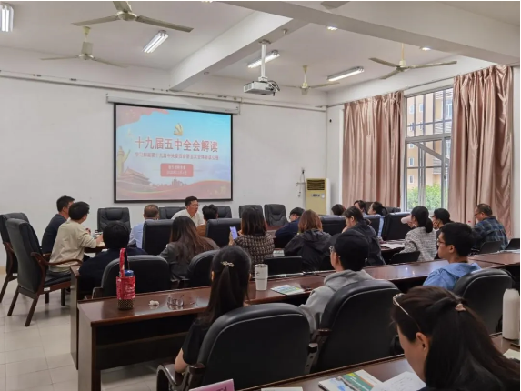 学院党委组织员查琳琳从指导思想、“十三五”以来取得的成就、总体目标等方面向全体教职工详细解读党的十九届五中全会精神,结合新闻视频专家解读等形式加深理论学习。