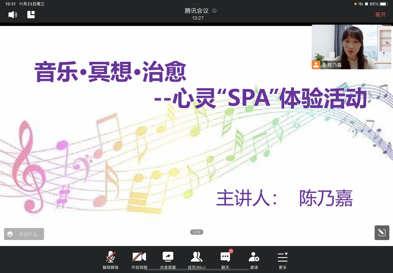 为进一步做好疫情防控下的心理战“疫”,强化学生应对疫情的心理应对能力,提升心理素质水平,11月23日,音乐学院音乐治疗辅导员工作室开展了“音乐•冥想•治愈——心灵‘SPA’”线上心理体验活动。活动邀请到了学院副教授、声乐教研室主任陈乃嘉博士作为主讲人。活动以二课活动的形式面向全校近300名同学开展,旨在引导同学们学会通过音乐冥想找回内心的宁静、快乐,学会保持豁达的心态,发现感知身边的美好。
