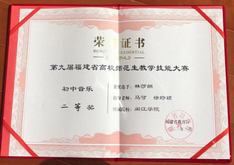 3月19日,在福建省教育厅主办的第九届福建省高校师范生教学技能大赛中,御书屋 2019级学生林莎朗斩获佳绩,获得二等奖。