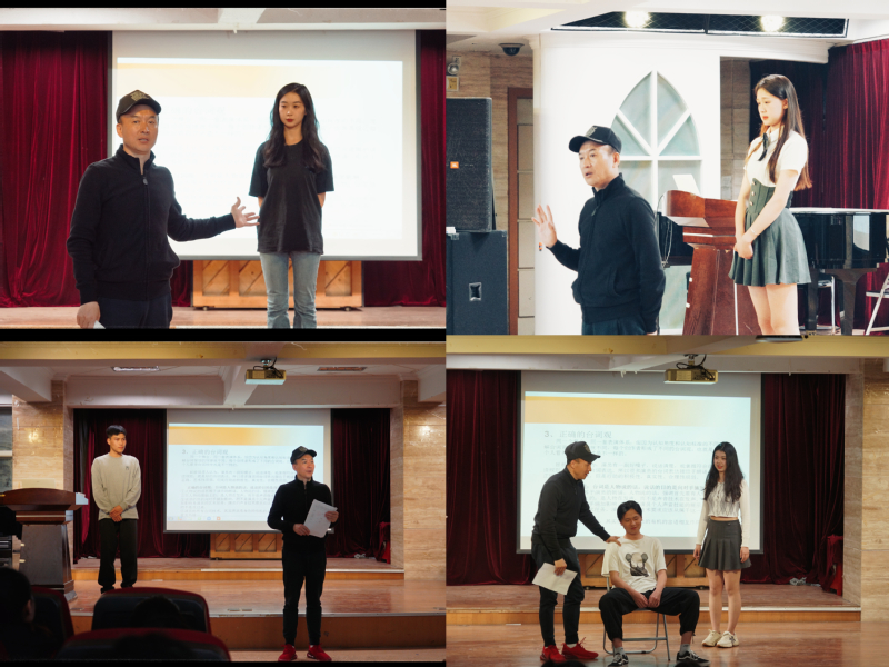 讲座期间,刘中哲副教授还对5名表演专业的同学现场进行一对一的台词片段指导。针对同学们的展示,他指出:台词的动机很重要,要以角色的身份和视角生活在舞台上。他强调:表演是错的,那么其他方面一定也是错的,台词和表演是一体两面,不可割裂的关系。