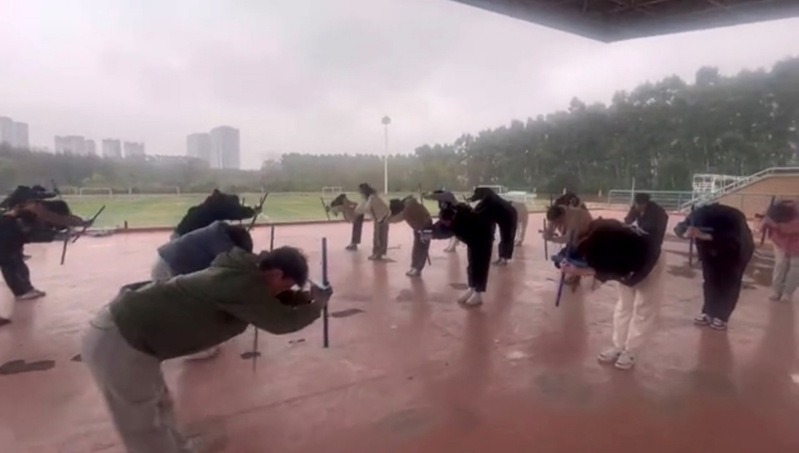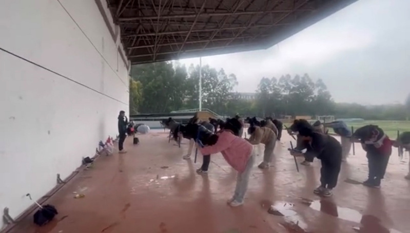 尽管下着大雨,同学们也没有被艰苦的环境所吓倒。大家在风雨中努力练习,不断纠正自己的错误,在锻炼中增强自己的毅力和耐性。