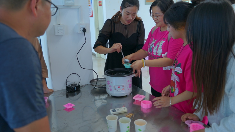 在福建胜华农业科技发展有限公司,全国劳动模范、第十三届、十四届全国人大代表卢玉胜向同学们分享了他回村带领村民种植油茶,发展油茶产业,帮助村民摆脱贫困,走上乡村振兴的道路的劳模故事。在讲解老师的带领下,同学们深入厂区详细了解了油茶种植、压榨、精炼的相关历史和工艺,了解传统与现代茶油压制原理,感受现代化制油生产工艺和茶油生产开发精深加工产业的生产全过程。并体验了油茶手工皂的制作,让同学们对油茶精深加工有了更加生动的感受,同学也在制作的过程中体验了自己动手的劳动乐趣。