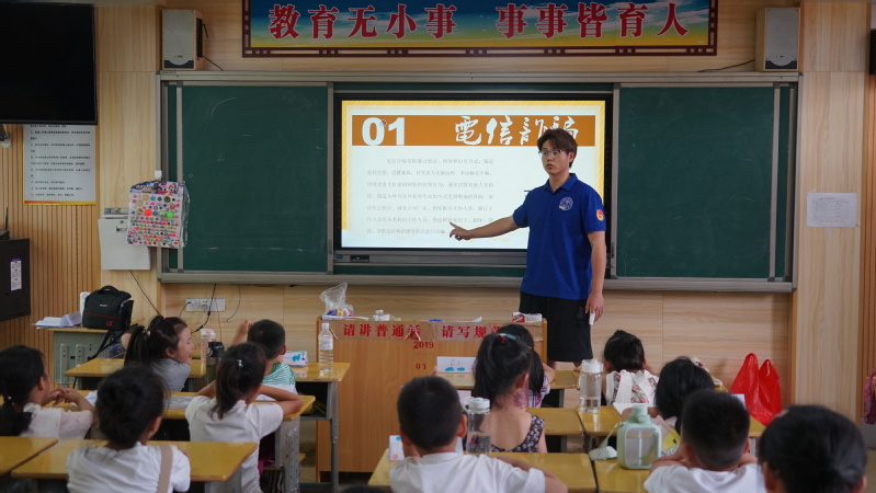 7月15日,暑假社会实践队深入蓬壶中心小学,开展金融知识主题的宣讲会,通过深入浅出的讲解,分发“防诈骗”宣传手册,切实提升小学生对金融知识的知晓度,为小朋友树牢防诈骗意识,避免学生及家长因法律和防诈骗意识淡薄受到不法分子的侵害。此外,支教队员利用专业特色,以“歌”为媒,改编填词“防诈骗”版《小星星》,组织小学生在课堂上合唱,将自身专业学习与资助育人紧密结合起来,沁润金融知识教育。