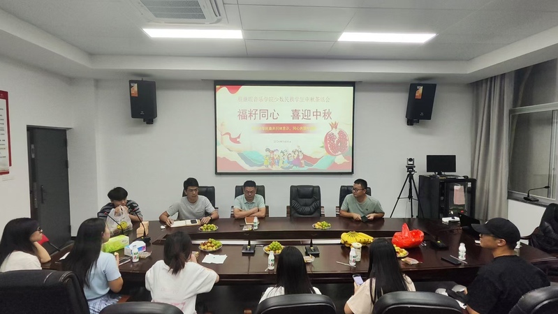 为深入贯彻落实习近平总书记关于加强和改进民族工作的重要思想,深化民族团结进步教育工作,铸牢中华民族共同体意识,进一步关心关爱少数民族学生的学习和生活,助其成长成才,2024年9月14日下午,音乐学院于艺术楼会议室召开了“福籽同心,喜迎中秋”少数民族座谈会。学院党委副书记林映平、团委书记罗强、辅导员黄祝泉以及少数民族同学共同参加。
