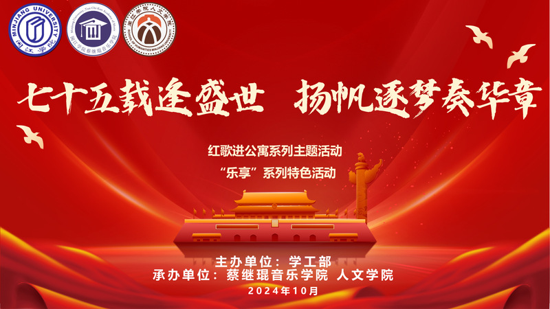 为庆祝中华人民共和国成立75周年,教育激励和鼓舞广大青年学生弘扬以爱国主义为核心的伟大民族精神,校学工部联合御书屋 、人文学院将于2024年10月9日下午14:00在立德社区3号楼人文学院传统艺文实训室举行“七十五载逢盛世,扬帆逐梦奏华章”红歌进公寓主题活动。