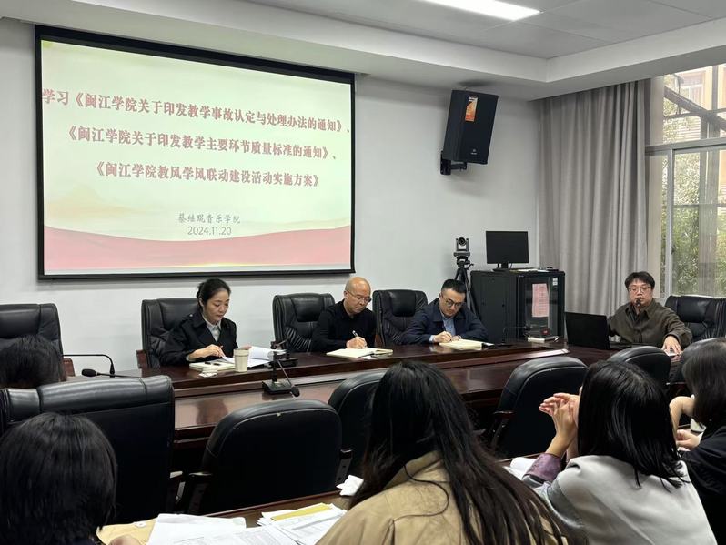 为进一步加强学院教学管理,规范教学行为,提升教风学风建设水平,11月20日,音乐学院组织全体教师开展了集中学习《御书屋 关于印发教学事故认定与处理办法的通知》《御书屋 关于印发教学主要环节质量标准的通知》《御书屋 教风学风联动建设活动实施方案》文件精神。