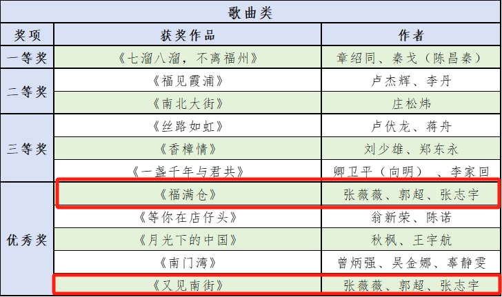 作品《福满仓》由张薇薇、张志宇作词,郭超作曲,曾获得仓山区首届“校地共建”联名文创设计大赛“闽江之心”特别主题赛道一等奖。