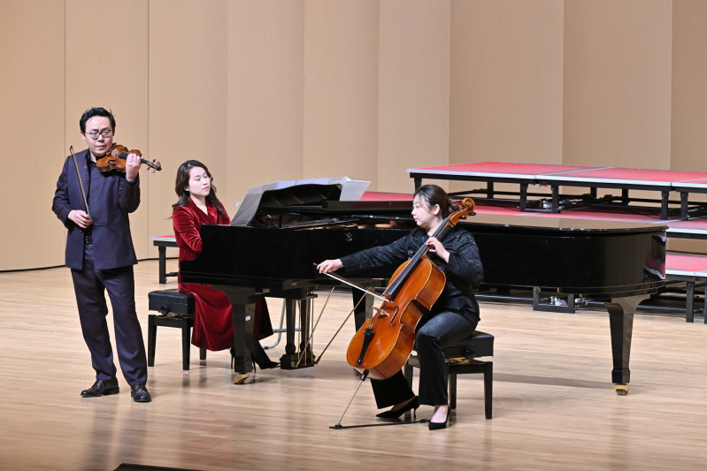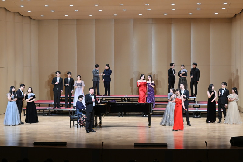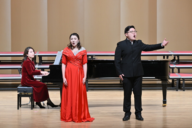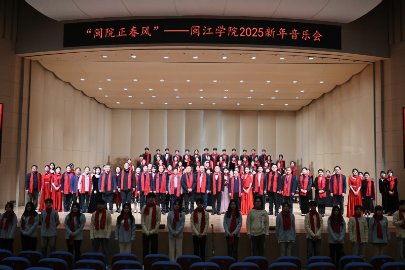 音乐会以一曲欢快的器乐合奏《春天的旋律》拉开序幕。女声小组唱《江畔独步寻花》,用和谐美妙的歌声,带领观众走进诗意的江畔。钢琴、中提琴、小提琴三重奏《All I ask of you》、歌剧片段表演《再别康桥》、歌剧二重唱《饮酒歌》以精湛的技艺、深情的演绎,让现场观众沉醉于艺术与情感的交织中。《祖国,我为你干杯》《月圆的时候》《我的祖国》等曲目,唱响了闽院师生对伟大祖国的深情告白。男高音独唱《峨眉酒家》,合唱《一荤一素》《雪花的快乐》传递了积极乐观的人生态度。“放眼望天地,春风十万里,南国山青青,北疆水碧绿……”在全体演员齐唱《春风十万里》的悠扬旋律中,新年音乐会落下帷幕。