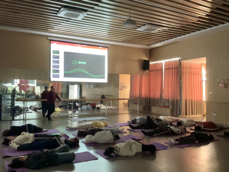 在活动中,林见南老师亲切询问了同学们的日常生活,从而了解到同学们现存的睡眠问题,并针对性地进行睡眠科普。随后,林见南老师发挥音乐专业的优势,带领同学们体验音乐治疗手段,同学们伴随着音乐和林见南老师的引导声中逐渐放松身体的各个部位,感受音乐带来的温暖。活动结束后,同学们纷纷表示:通过科学地引导,对于如何借助音乐缓解压力有了更进一步的了解,今后也会持续学习音乐疗愈相关知识并应用于生活之中。