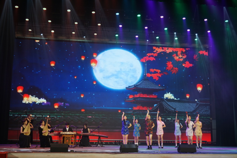 高云凤等同学身着旗袍,在舞台上翩翩起舞。灵动的步伐、优美的舞姿,寄情于明月,营造出如梦如幻的意境。扬琴清脆、古筝悠远、琵琶灵动,民乐重奏与舞蹈相映成趣,为晚会注入一抹皎洁如月的华彩。古典文化的独特魅力在她们的演绎下尽情绽放,仿佛将观众带入了一个古典的诗意世界。