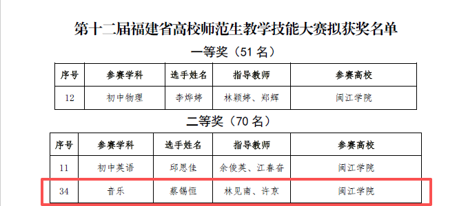 2025年12月6日,由福建省教育厅主办的第十二届福建省高校师范生教学技能竞赛在宁德师范学院举行。音乐学院2022级音乐学(师范)专业学生蔡锡恒表现出色,荣获二等奖。