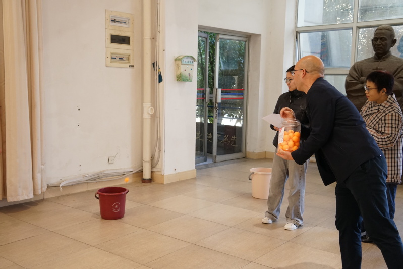 30秒中的时间里,大家争分夺秒,乒乓球如雨点般落入球筐。投入数量多的老师满脸自豪,数量稍少的也不气馁,互相鼓励着下次再来。
