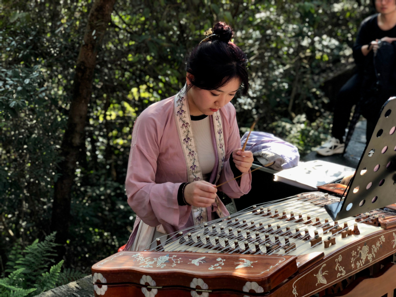 由音乐学院的张婧琪、陈林娟、林心琬、欧阳一心和邵雯组成的乐器表演小分队,分别在景区入口、相怀梅园、古泉跌水、岩梅古台四处设点,为游客带来了扬琴、古筝、琵琶和竹笛演奏,为游客们带来了《兰亭序》、《清明雨上》、《春到湘江》、《海峡音诗》等古典曲目的演奏。琴声、笛声悠长,与山间鸟鸣遥相应和,合奏着林间交响曲,吸引了众多游客一一驻足停留欣赏并纷纷拿出手机拍照、录像、合影。