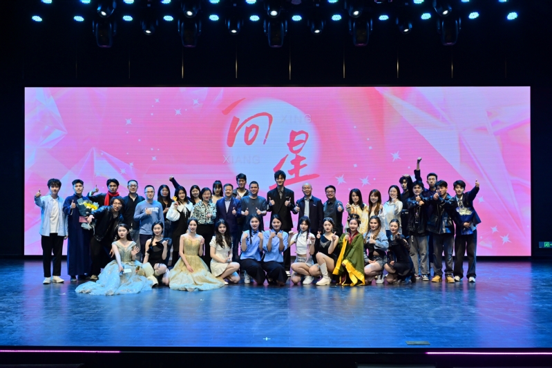 最后,在场的领导、老师和表演人员上台影留念,为演出画上圆满的句号。本次演出是22级表演专业全体20名同学自入学以来,在课余时间进行了充分的排练和磨合的最终呈现,尤其是演出前夕还有军训等事项的紧凑安排,同心山成玉、协力土成金,演出的顺利开展体现了他们锐意进取、精益求精的精神。