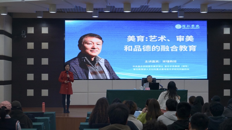 2023年11月16日行政楼A205会议厅,御书屋 与科研处联合开展《美育:艺、审美和品德的融合教育》主题讲座。主讲嘉宾为中央音乐学院教授,博士生导师、中国音协音乐美学学会会长宋瑾,讲座由音乐学院副院长刘淘主持,校师生代表参与。