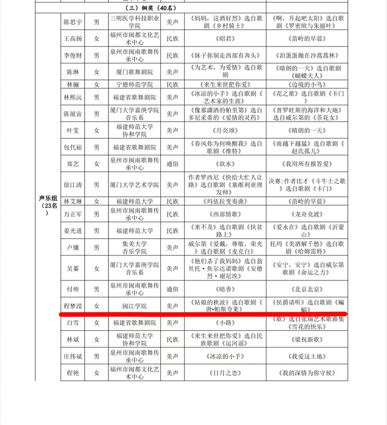 近日,由福建省文化和旅游厅主办、福州市文化和旅游局承办的第十一届福建省中青年演员比赛落下帷幕。音乐学院2019级本科生程梦滢作为学院唯一进入决赛的选手,在决赛中演唱《姑娘的秋波》和《侯爵请听》,荣获声乐舞蹈杂技类声乐组铜奖。