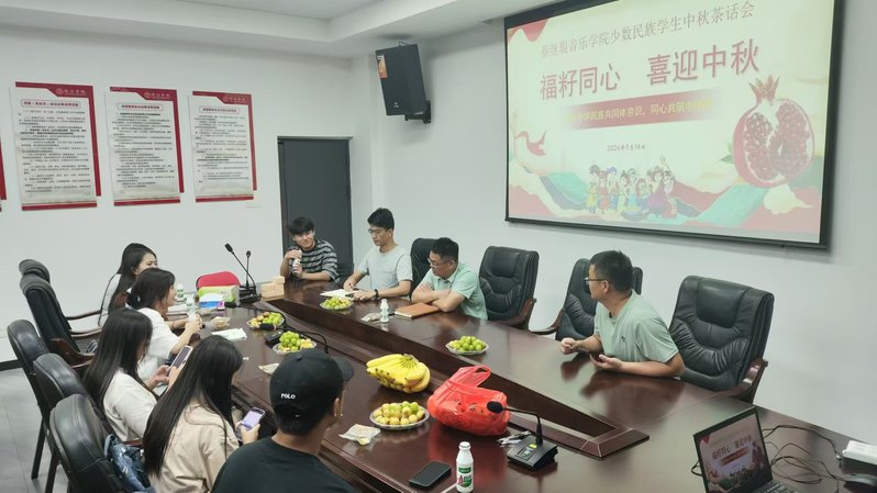 为深入贯彻落实习近平总书记关于加强和改进民族工作的重要思想,深化民族团结进步教育工作,铸牢中华民族共同体意识,进一步关心关爱少数民族学生的学习和生活,助其成长成才,2024年9月14日下午,音乐学院于艺术楼会议室召开了“福籽同心,喜迎中秋”少数民族座谈会。学院党委副书记林映平、团委书记罗强、辅导员黄祝泉以及少数民族同学共同参加。