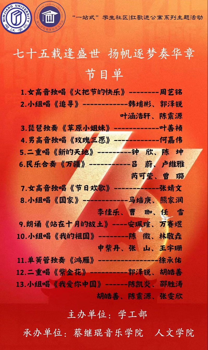 为庆祝中华人民共和国成立75周年,教育激励和鼓舞广大青年学生弘扬以爱国主义为核心的伟大民族精神,校学工部联合御书屋 、人文学院将于2024年10月9日下午14:00在立德社区3号楼人文学院传统艺文实训室举行“七十五载逢盛世,扬帆逐梦奏华章”红歌进公寓主题活动。