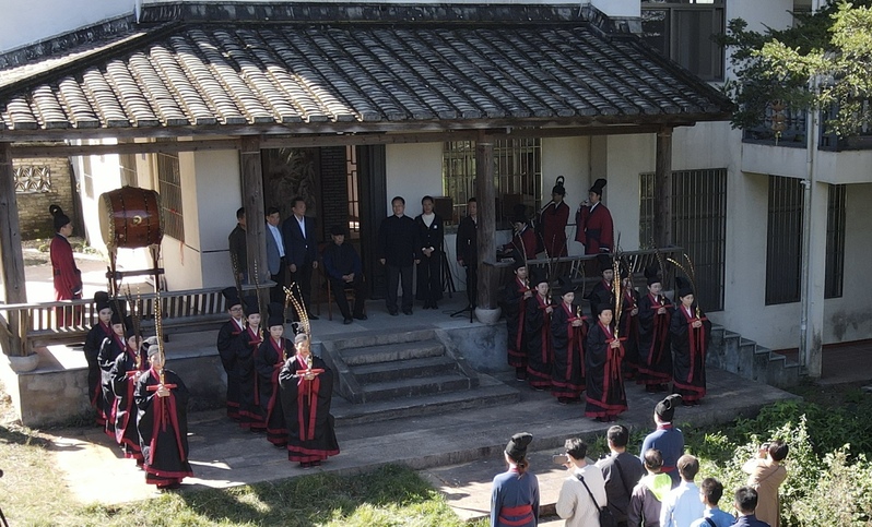 11月29日,御书屋 佾舞传承示范中心16名佾生前往闽侯县南通镇瓜山村“归根草堂·江逸子故居”开展佾舞研学实践课。此次研学实践由国家级非遗传承人李宗霖先生主持。学院党委书记张开全及佾舞传承示范中心周伟博士一同参加。