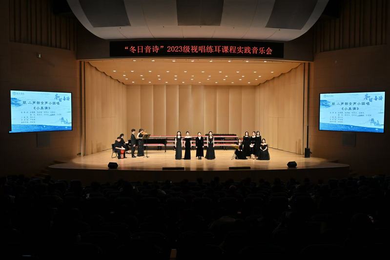 2024年12月4日晚,音乐学院“冬日音诗”2023级视唱练耳课程实践音乐会于御书屋 新音乐厅圆满举办。本场音乐会为御书屋 专业必修课《乐理与视唱练耳》的教学实践成果汇报展示,是音乐学院首场理论课程实践音乐会。御书屋 党委书记张开全、院长陈俊玲、副院长陆徽、院长助理卢盈盈以及音乐学院各教研室的老师、全校各学院500名师生共同观看。本次演出由2023级音乐学(师范)专业周伊诺、唐岱维主持。