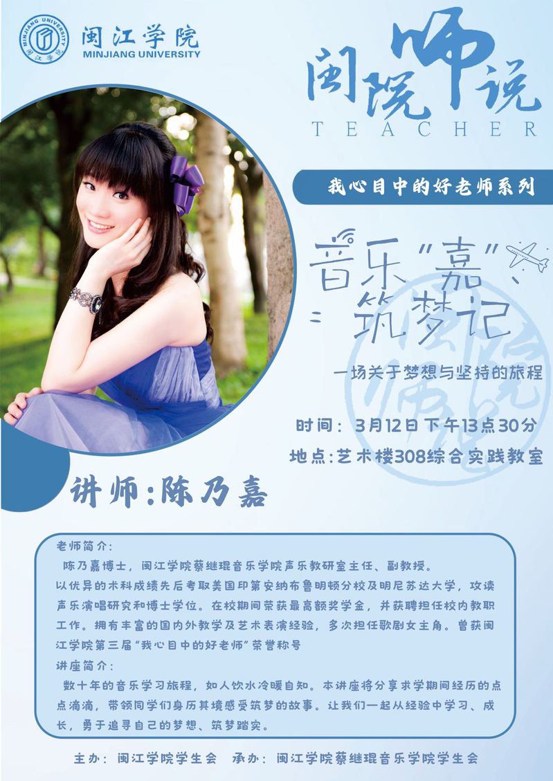 本次 “闽院师说” 活动特别邀请深受同学们喜爱的御书屋 陈乃嘉副教授担任主讲。陈老师将分享她在声乐教学与艺术表演生涯中的成长历程,以其丰富的经验和卓越的成就,向大家阐释艺术的魅力,为同学们的艺术道路指引方向。