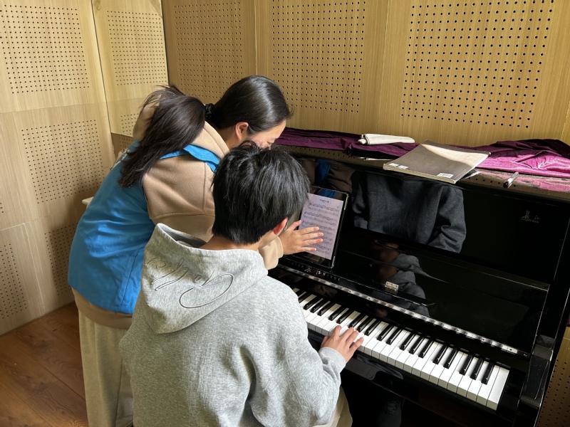 教学过程中,音乐学院志愿者先从基础钢琴音符键位讲起,用简单易懂的方式解释音符、节拍和音阶,并循序渐进开展钢琴指法教学。区别于平常熟悉的烧杯、试管,材化同学们第一次触碰钢琴,双手略显生疏。志愿者们一对一耐心指导,轻轻纠正同学们的手型,“手指要像搭房子一样,稳稳立在琴键上,这样弹出来的声音才饱满。”在志愿者的帮助下,大家逐渐掌握了要领,开始小心翼翼地弹奏简单音符。