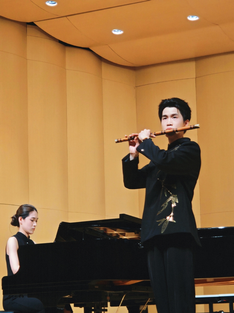 本场音乐会曾德鸿带来多首经典竹笛曲目,《扬鞭催马运粮忙》生动展现丰收后农民运送公粮的欢快场景;《春到湘江》尽显湖南音乐特色与建设豪情;《牧民新歌》勾勒出内蒙古大草原的生机;《大漠》描绘丝路驼队的艰辛与喜悦;《喜相逢》讲述情人的惜别与重逢;《牧笛》则展现牧人悠然生活。每首乐曲都在曾德鸿的精彩演绎下,配合钢琴伴奏林佳瑾的出色发挥,赢得现场阵阵掌声。