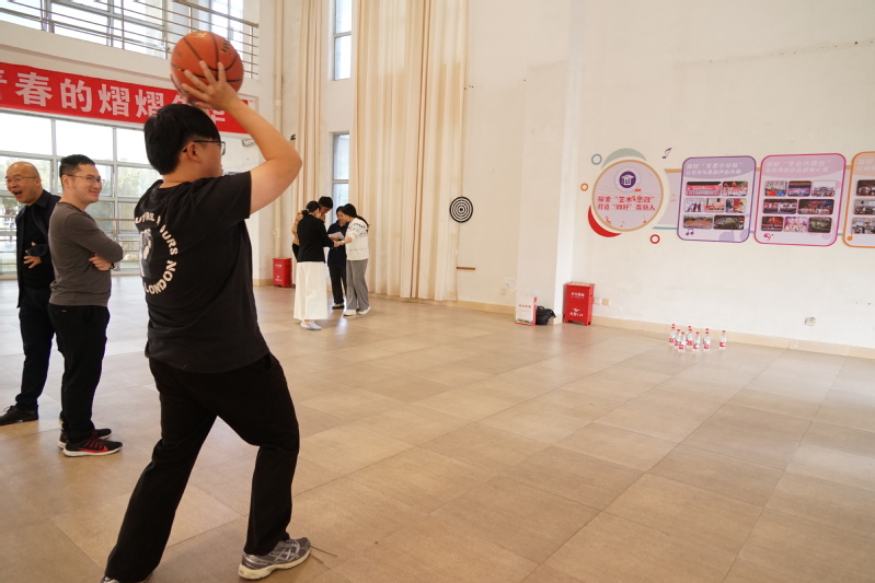 矿泉水瓶整齐排列,老师们手持篮球,瞄准目标,用力一掷。他们身姿矫健、轻盈,尽显活力。赛场上高分球频现,欢呼声此起彼伏,充满着激情与活力。